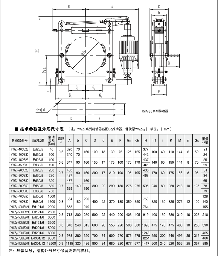 電力液壓制動(dòng)器是使機械中的運動(dòng)件停止或減速的機械零件。俗稱(chēng)剎車(chē)、閘。制動(dòng)器主要由制架、制動(dòng)件和操縱裝置等組成。有些制動(dòng)器還裝有制動(dòng)件間隙的自動(dòng)調整裝置。為了減小制動(dòng)力矩和結構寸, 制動(dòng)器通常裝在設備的高速軸上,但對性要求較高的大型設備(如礦井提升機、電梯等)則應裝在靠近設備工作部分的低速軸上。有些制動(dòng)器已標準化和系列化,工廠(chǎng)制造以供選用。
