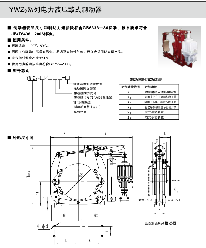 電力液壓制動(dòng)器是使機械中的運動(dòng)件停止或減速的機械零件。俗稱(chēng)剎車(chē)、閘。制動(dòng)器主要由制架、制動(dòng)件和操縱裝置等組成。有些制動(dòng)器還裝有制動(dòng)件間隙的自動(dòng)調整裝置。為了減小制動(dòng)力矩和結構寸, 制動(dòng)器通常裝在設備的高速軸上,但對性要求較高的大型設備(如礦井提升機、電梯等)則應裝在靠近設備工作部分的低速軸上。有些制動(dòng)器已標準化和系列化,工廠(chǎng)制造以供選用。